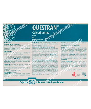 Before using Questran, inform your doctor if you have bowel obstruction, digestive disorders, or pancreatitis. Adequate fluid intake is important to prevent constipation. Inform your healthcare provider of any other medications, as timing may affect absorption.